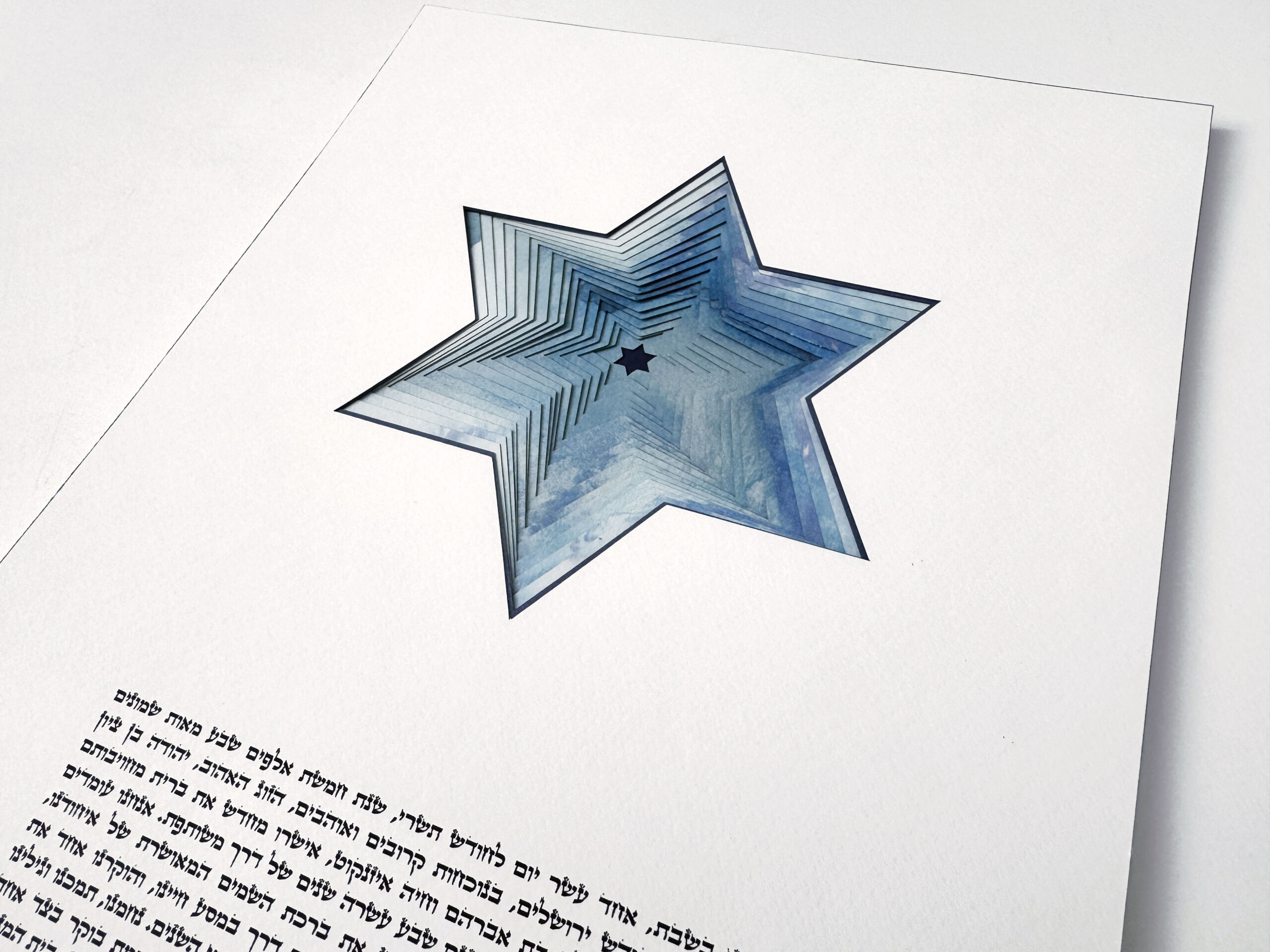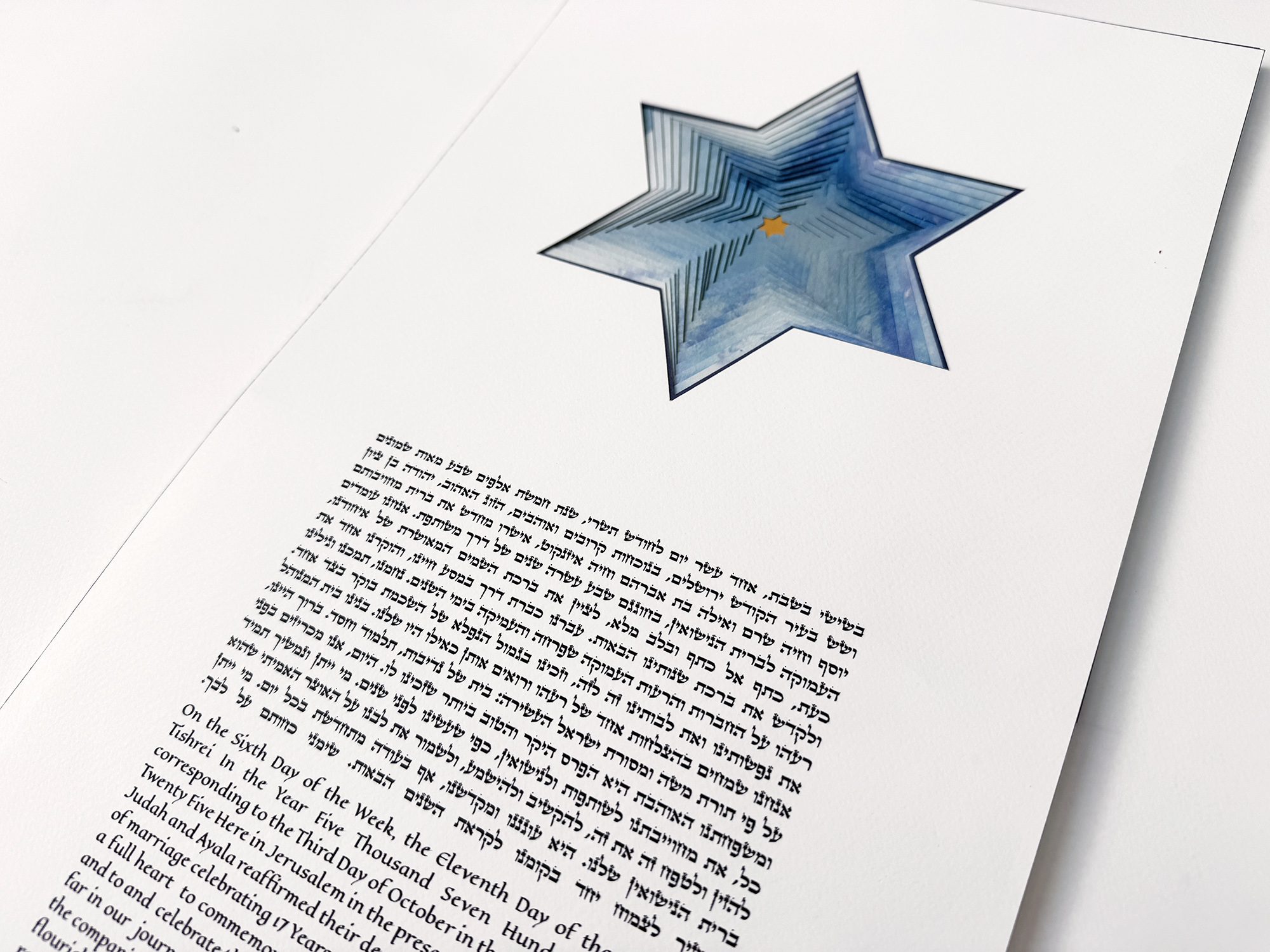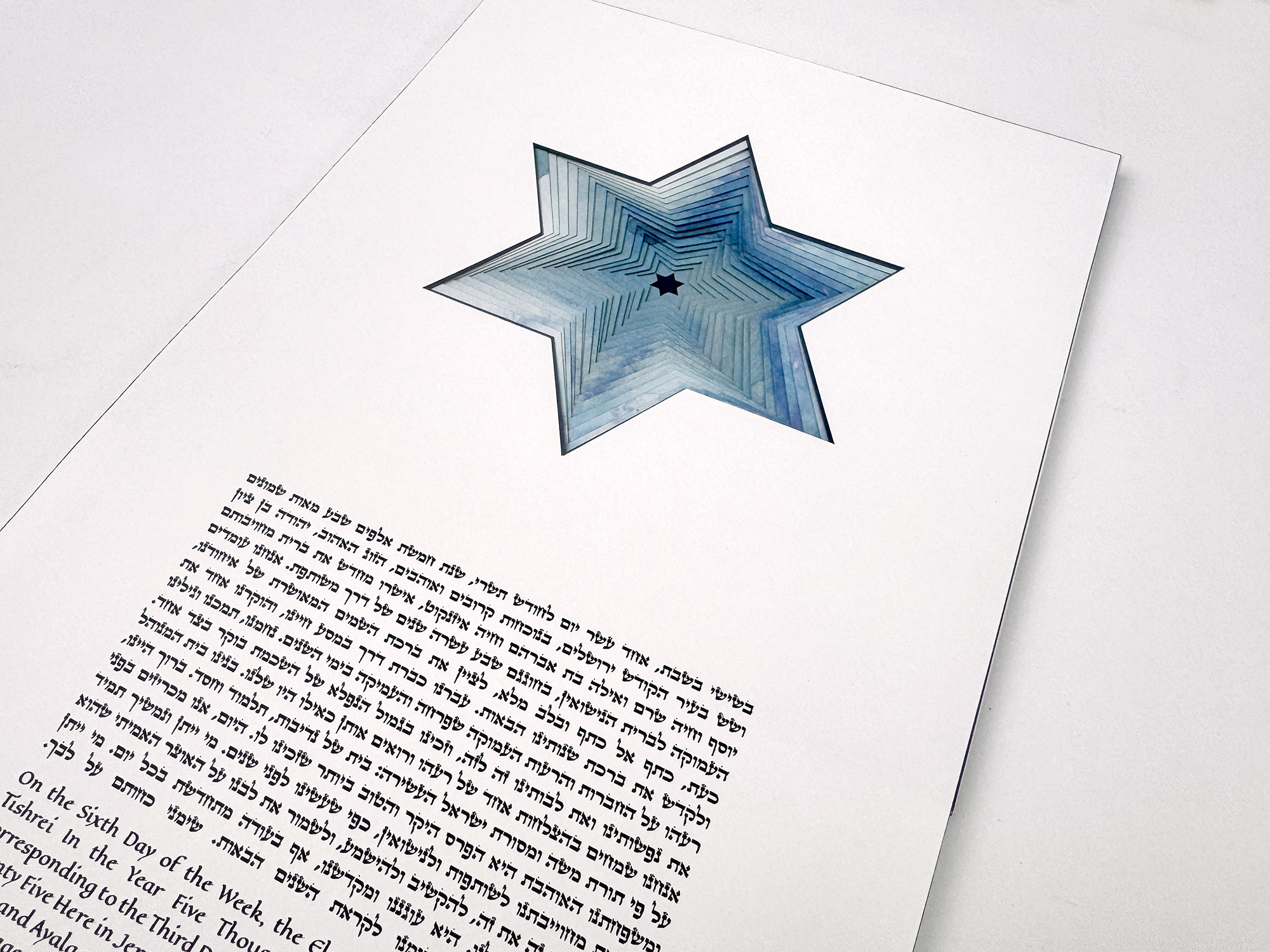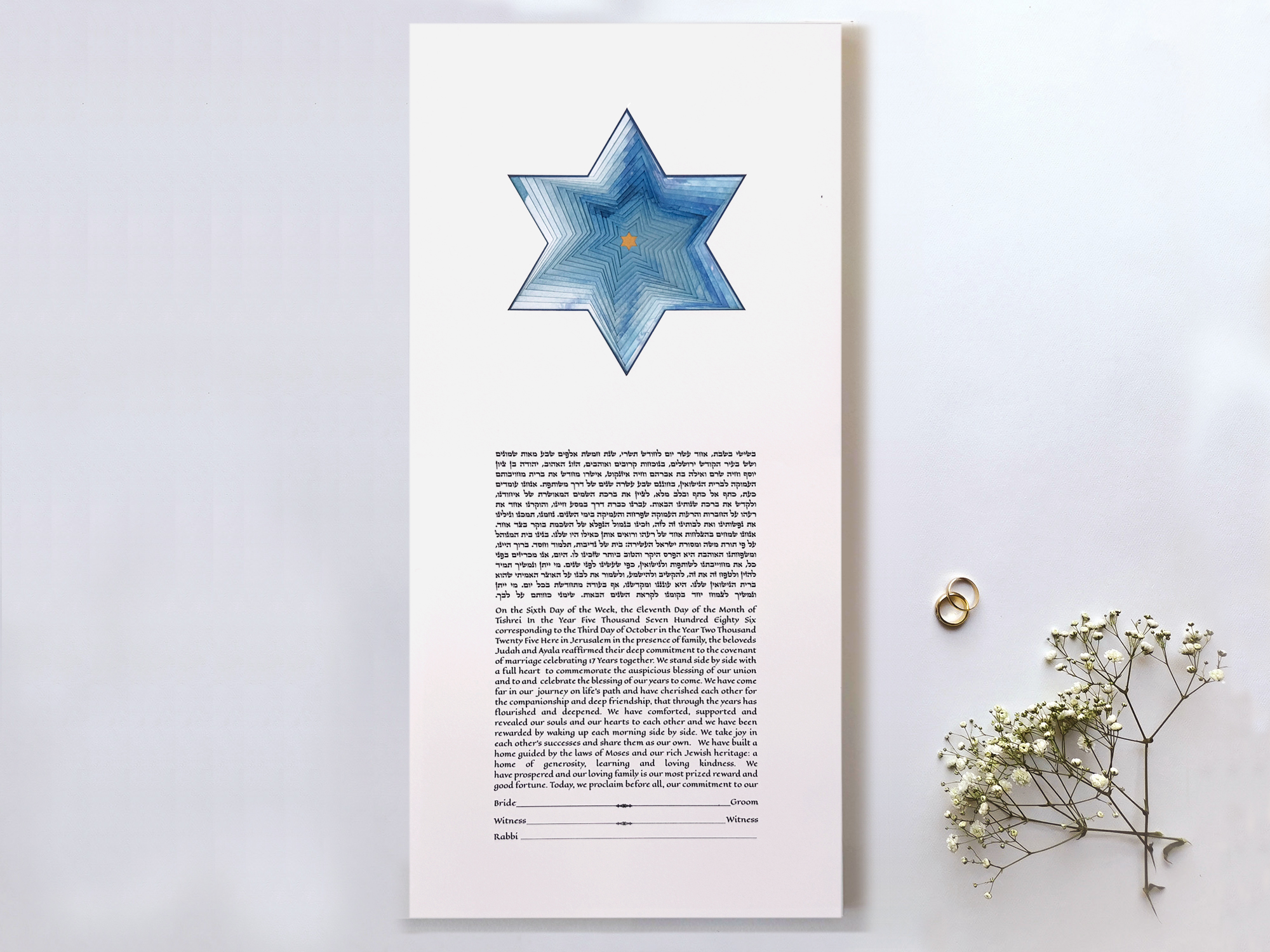 Choosing the Star of David ketubah brings strength, blessing, and heritage into your wedding—making it not only a beautiful work of art, but a meaningful expression of Jewish heritage and identity. Especially in these days, when many Jews feel hesitant to openly show their Judaism, this ketubah becomes a proud and powerful statement of who we are. Standing beneath the chuppah, you are not only uniting as a couple—you are building a new Jewish home filled with tradition, continuity, and light.