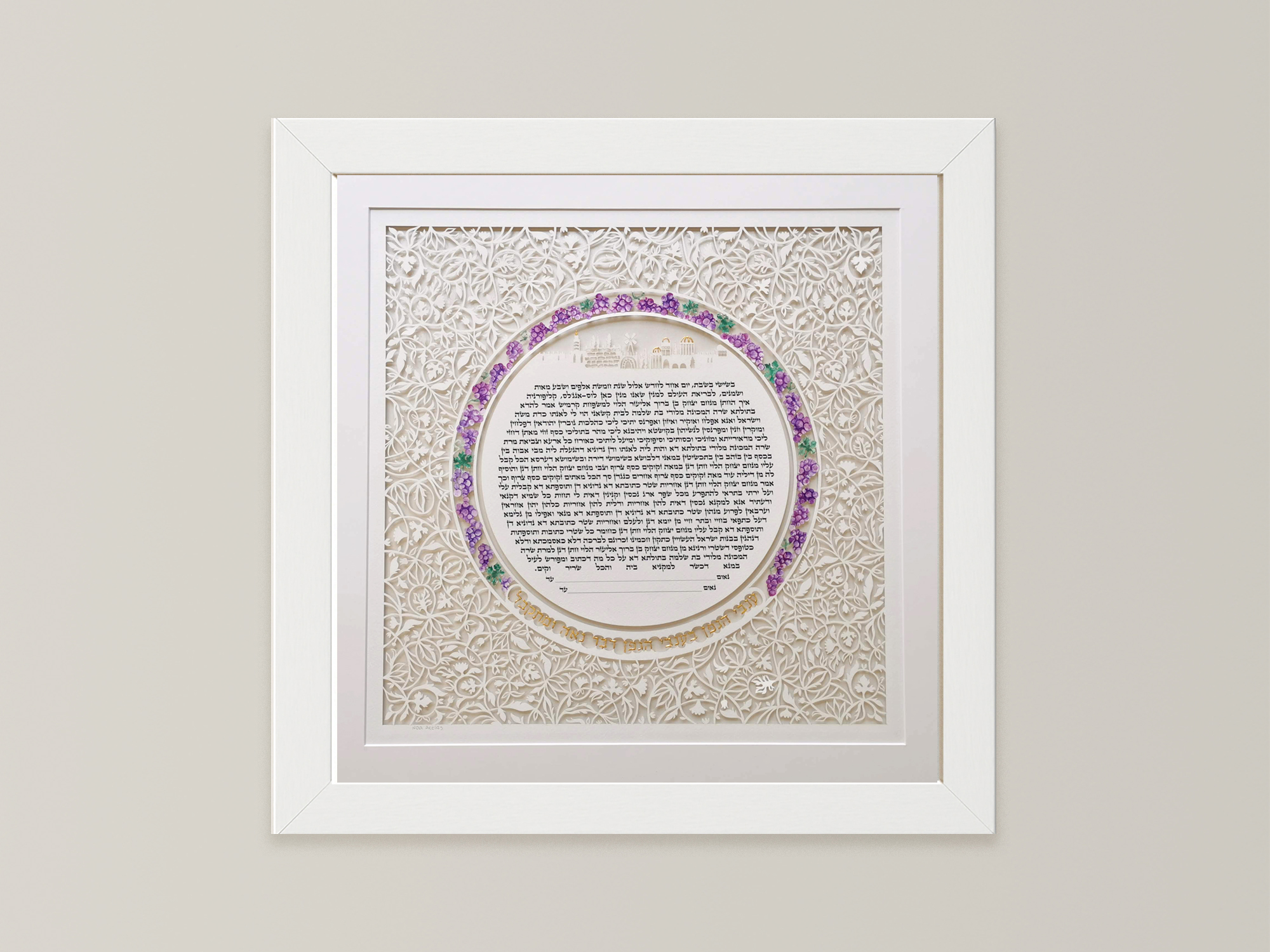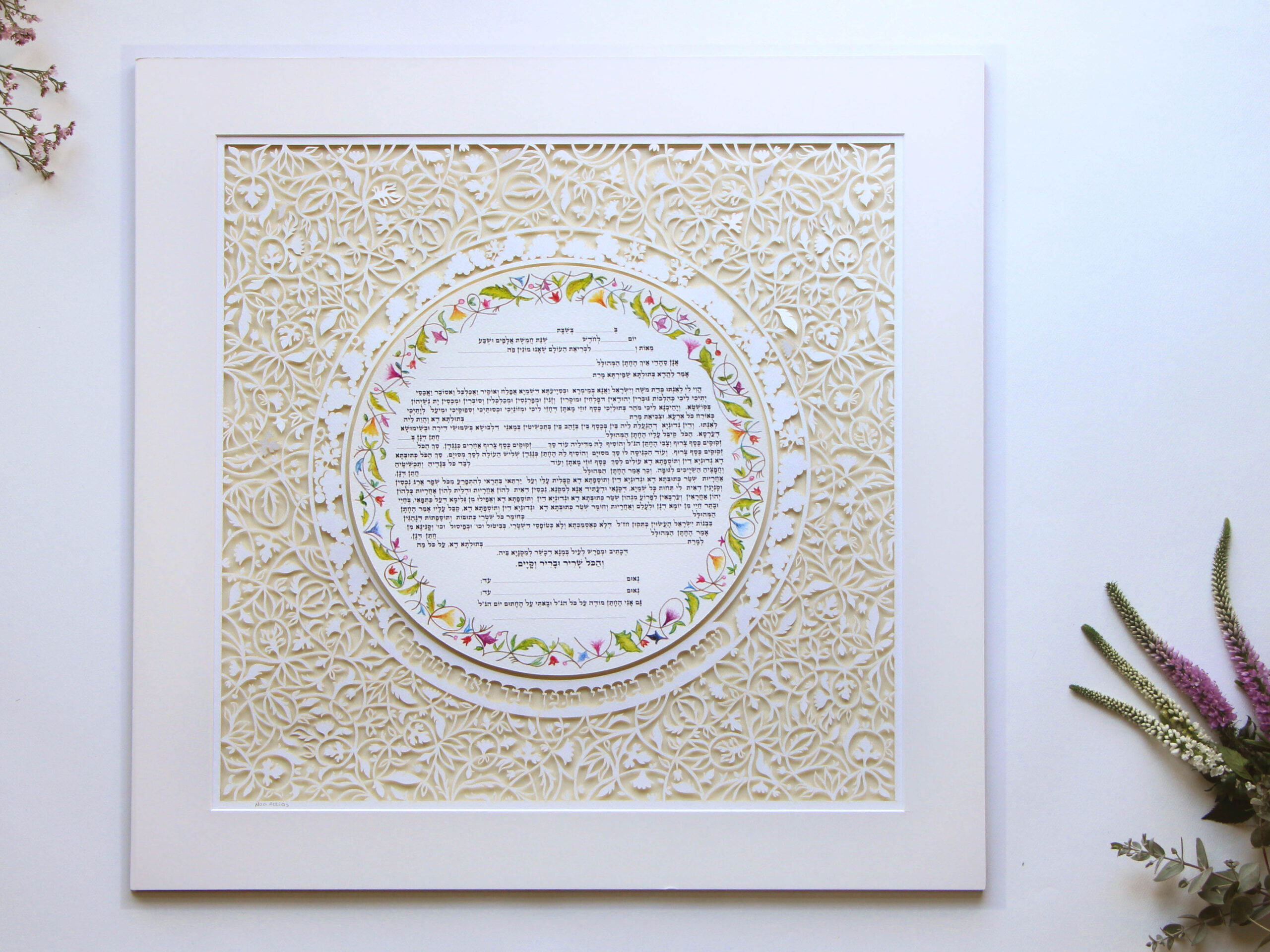 Our Ketubahs are cut out on fine art paper of the highest quality and the text and flowers are printed on Gicle Museum art paper.