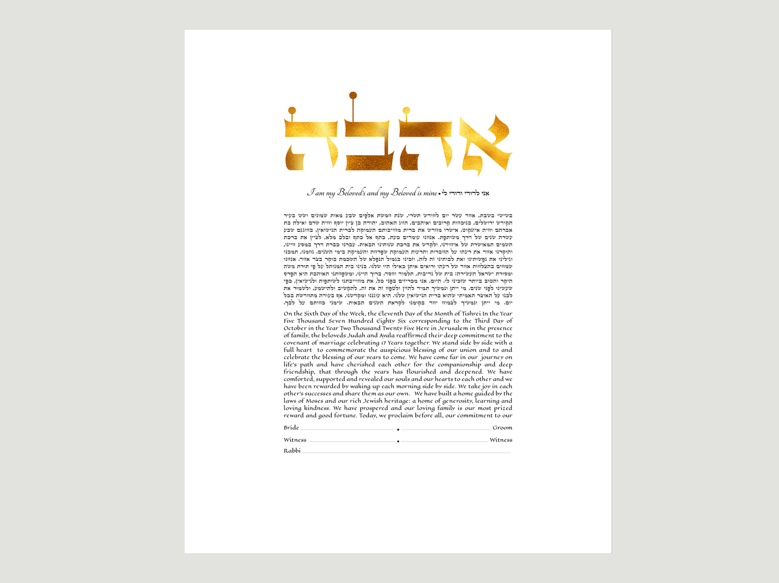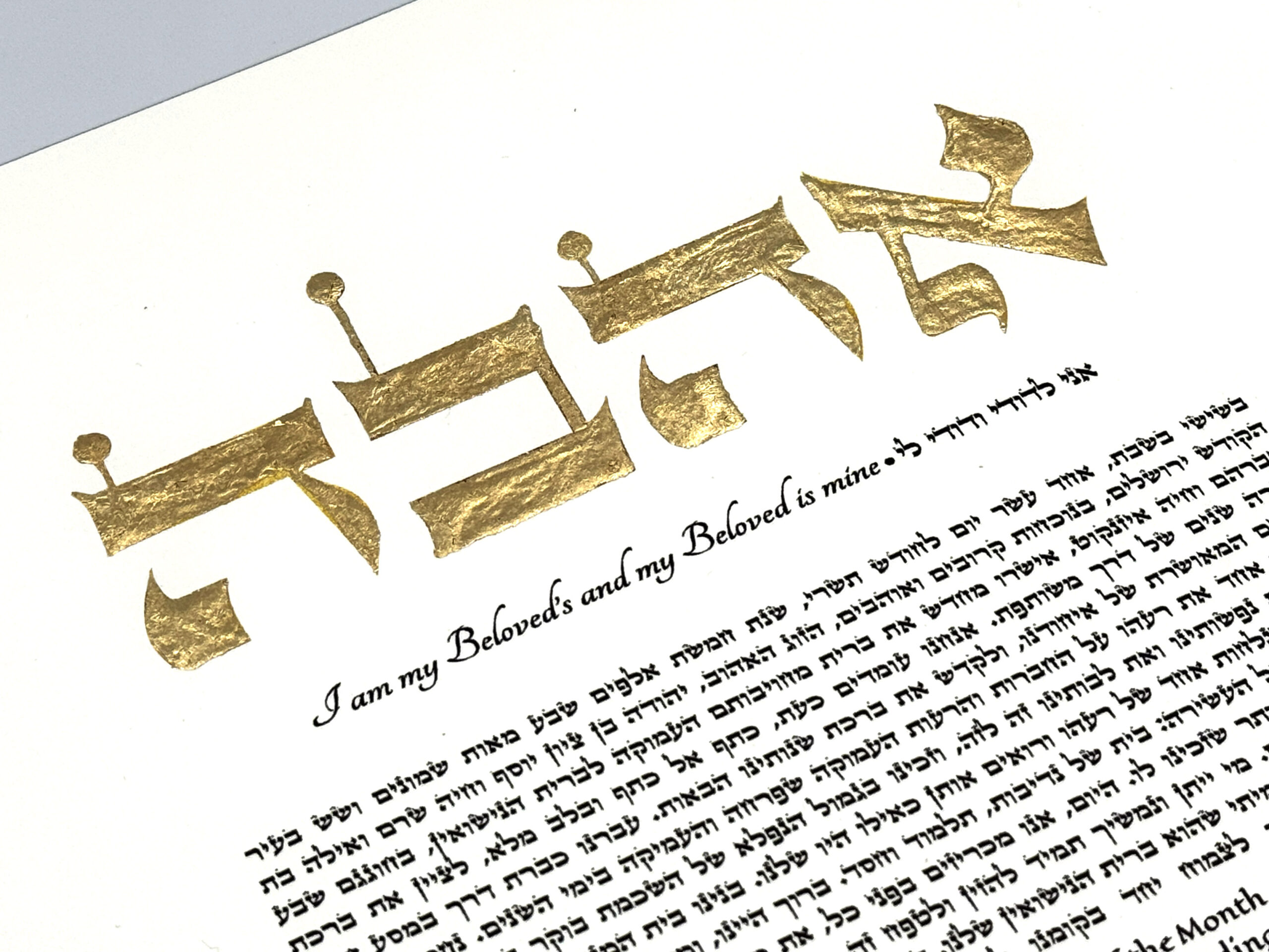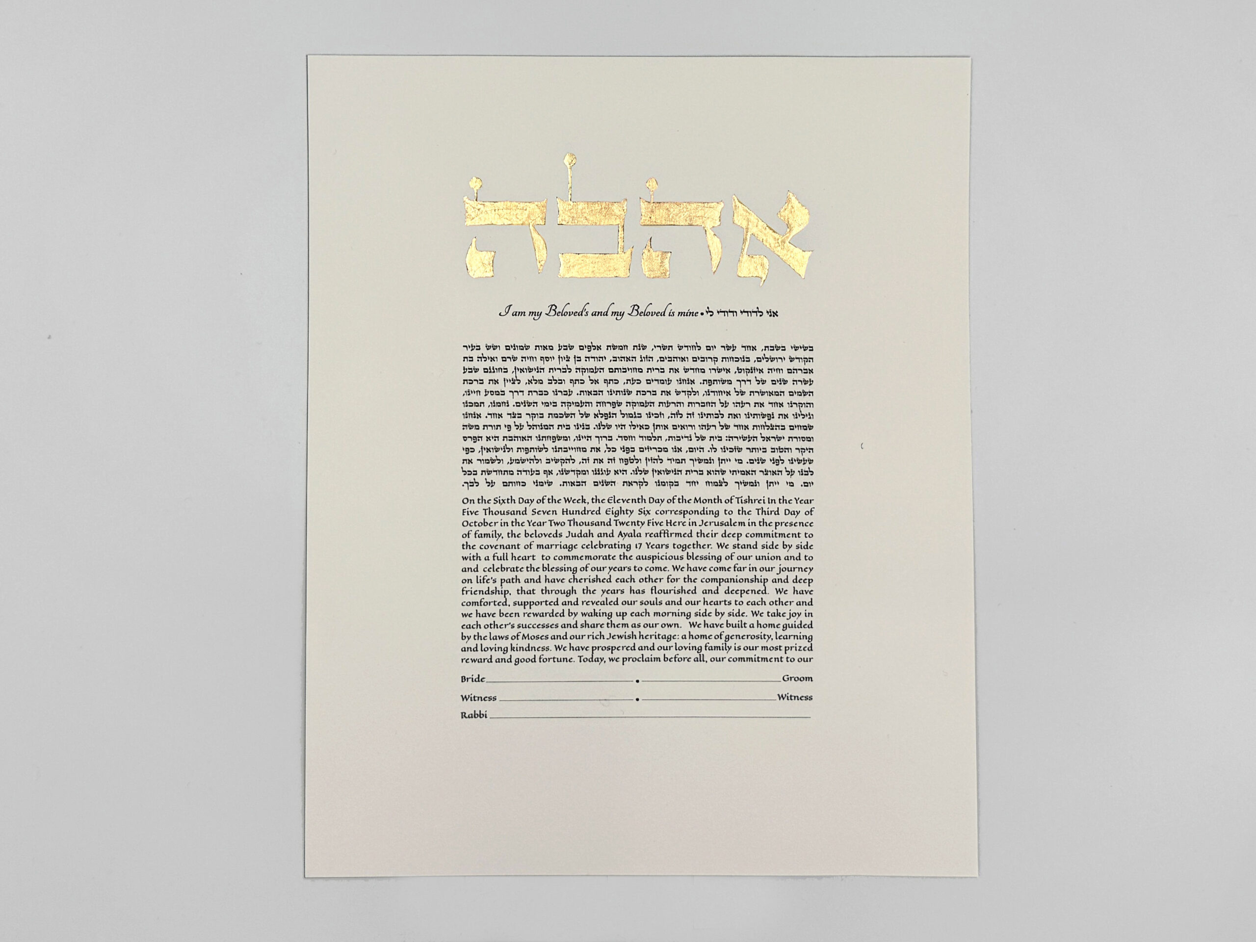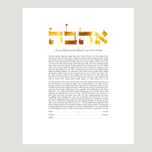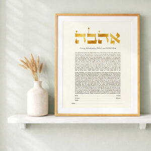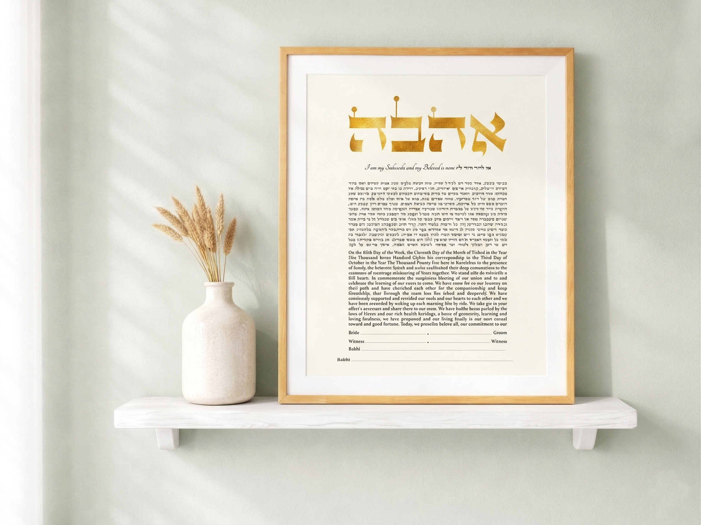 This custom Ketubah is made to order for your wedding day and features the word LOVE אהבה in an elegant gold design. Carefully crafted, it symbolizes love, commitment, and the beginning of a shared journey.