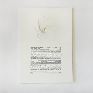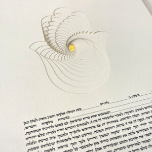 This ketubah is made of high-quality paper and the result is a fine art piece. All paper that is used is acid-free to promise many years to enjoy the ketubah. It is a Papercut Ketubah with a digital gicle print, having a modern design. This ketubah is unique and it will impress all the guests.
