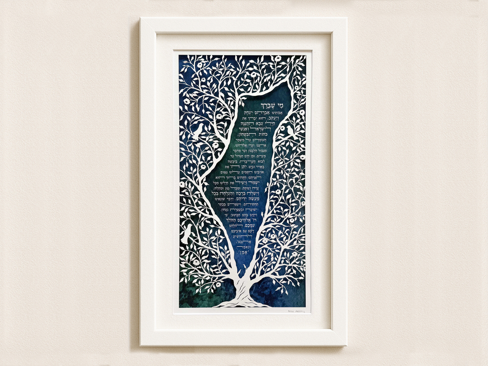 I create each papercut on high-quality archival, acid-free fine art paper to ensure durability and long-lasting beauty. The artwork also includes a hand-painted background, available in blue tones or multicolor, and printed on museum-quality Giclée art paper.