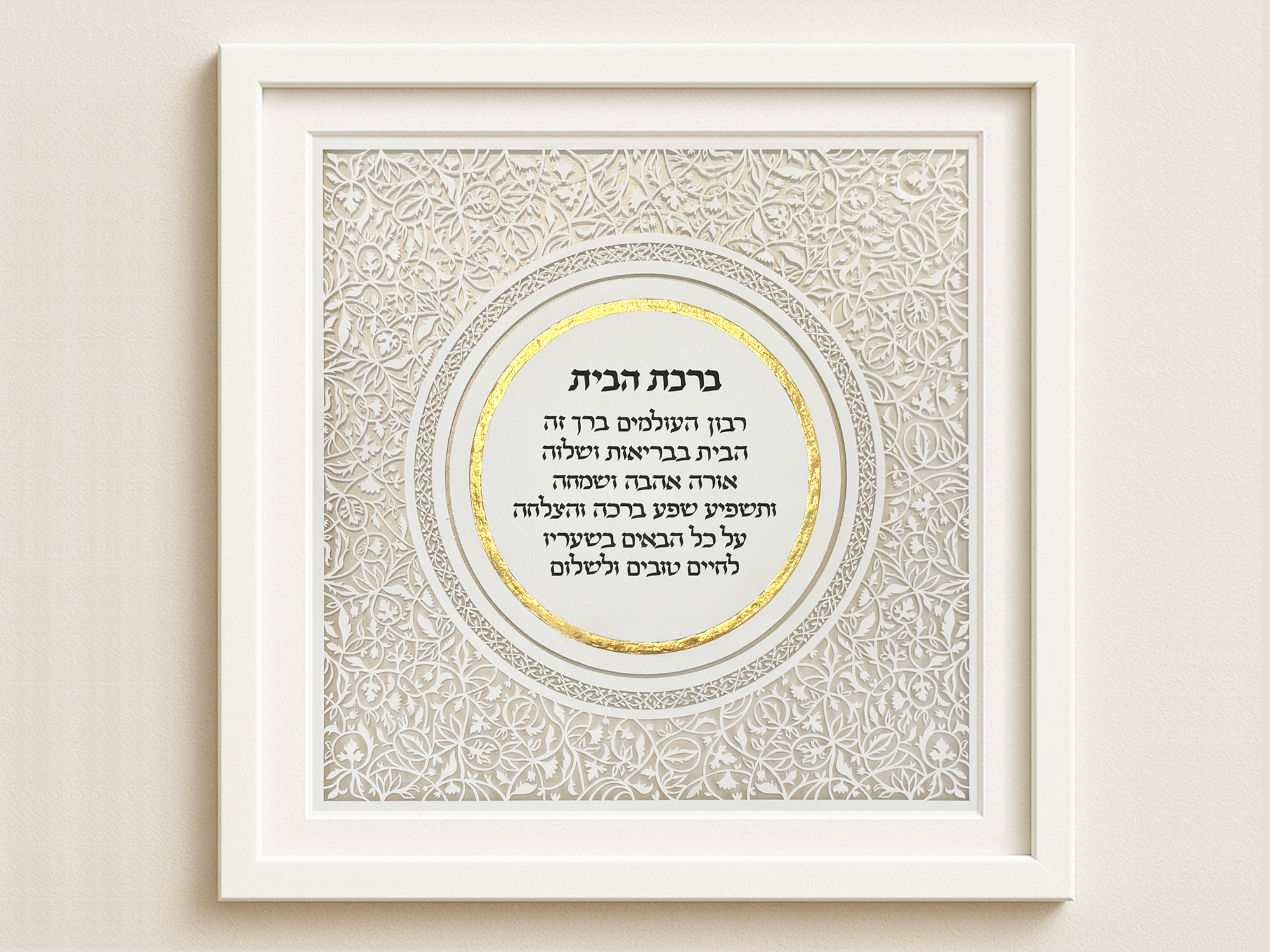Discover our beautiful House Blessing Papercut, crafted from high-quality fine art paper. This unique housewarming gift is perfect for weddings and special occasions. Displayed in the home, this Jewish prayer brings blessings of health, tranquility, light, love, and joy. Surrounding the blessing is a circle adorned with either gold paint or gilded with 24K gold leaf, adding a rich and sparkly touch.