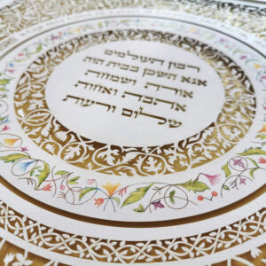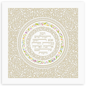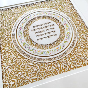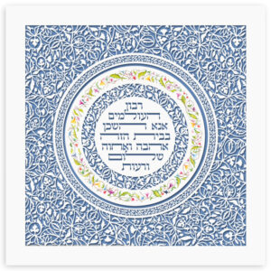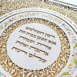 Pictured here with a custom text, the home blessing is offered with standard Hebrew text and the English translation is a positive variation on the traditional Jewish home blessing.