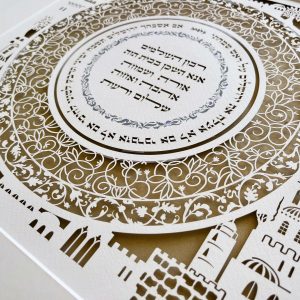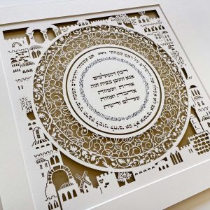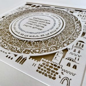 Pictured here with a custom text, the home blessing is offered with standard Hebrew text and the English translation is a positive variation on the traditional Jewish home blessing.