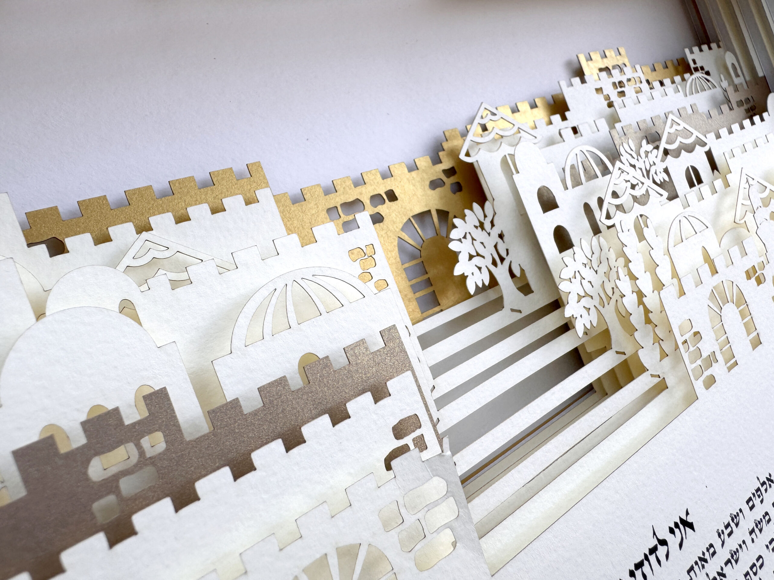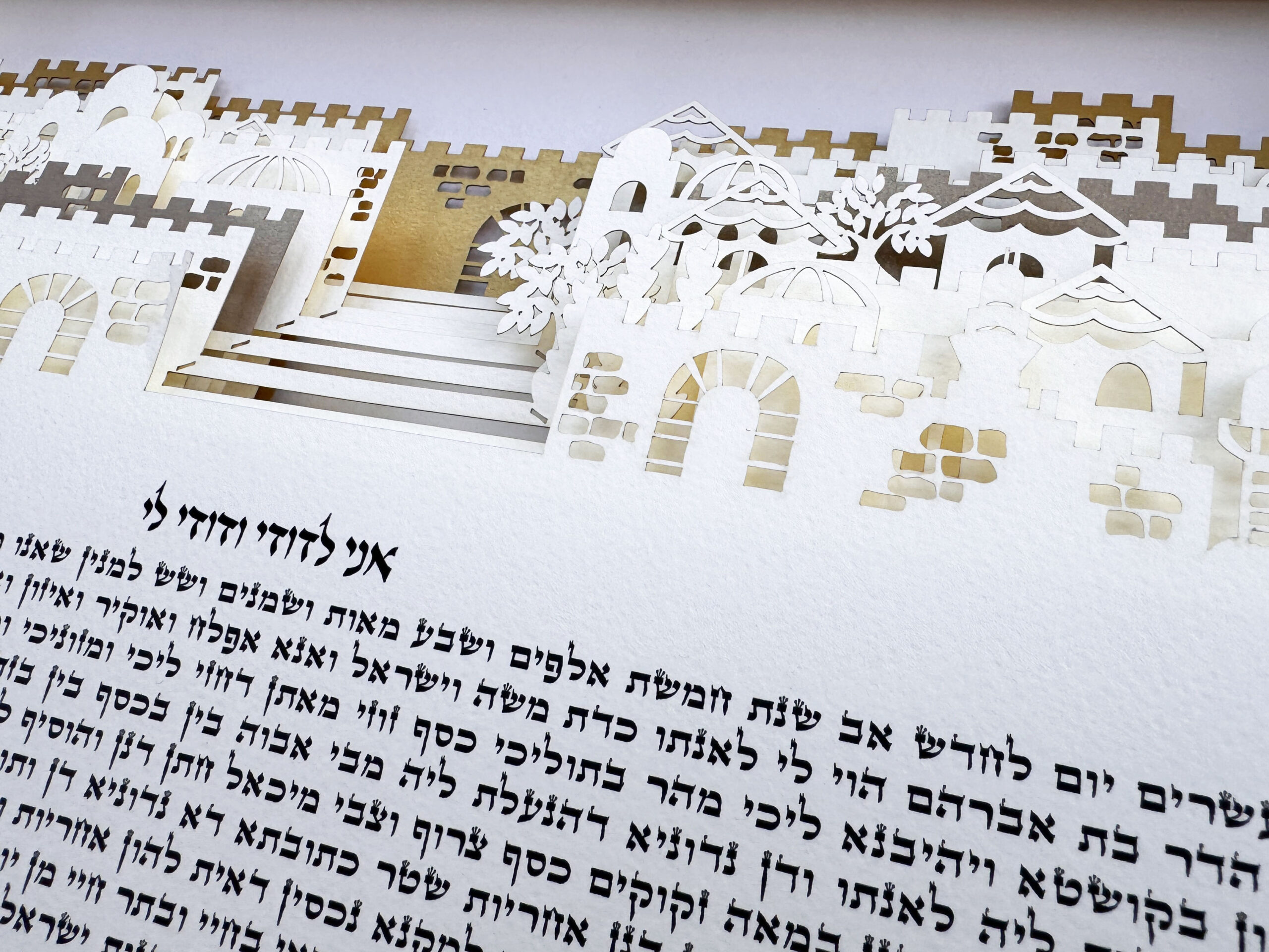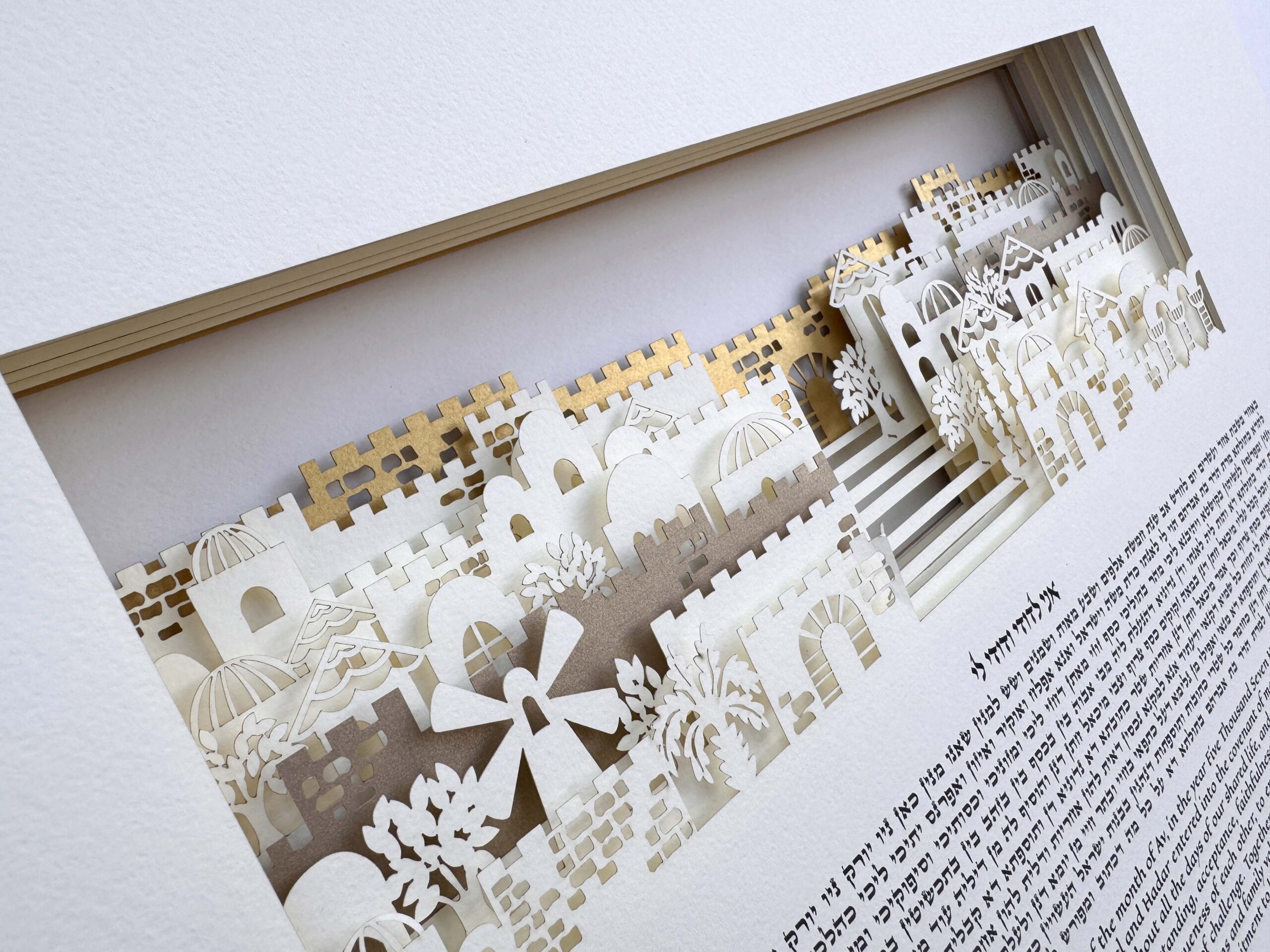 This Jerusalem skyline ketubah features a handcrafted 7-layer papercut inspired by the timeless architecture of the Old City. Designed for modern Jewish weddings, this Jerusalem wedding ketubah transforms your vows into meaningful Jewish wedding art rooted in heritage and strength.