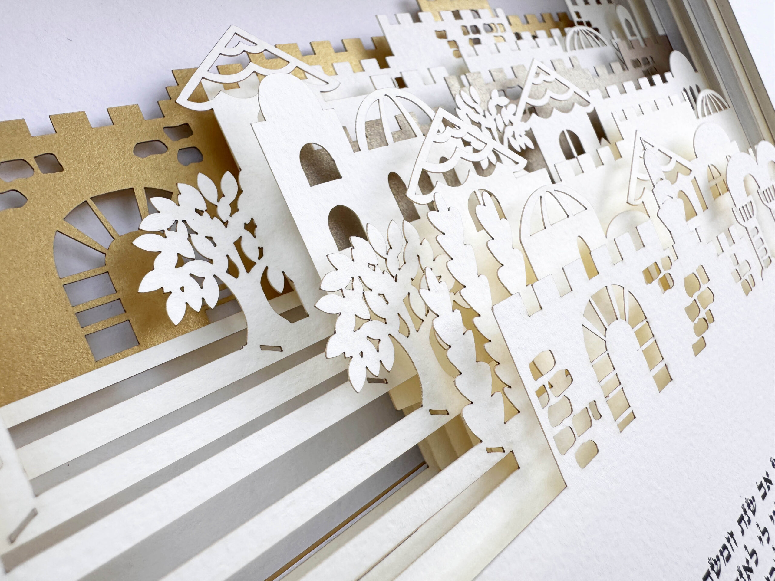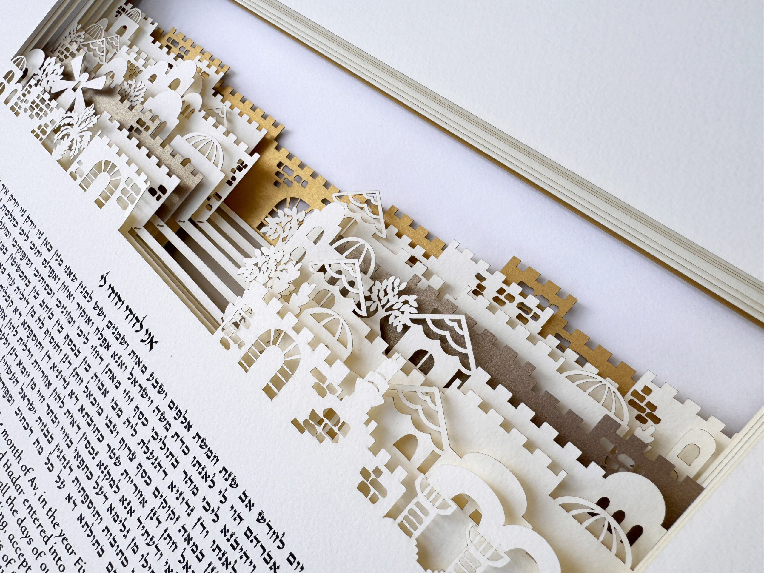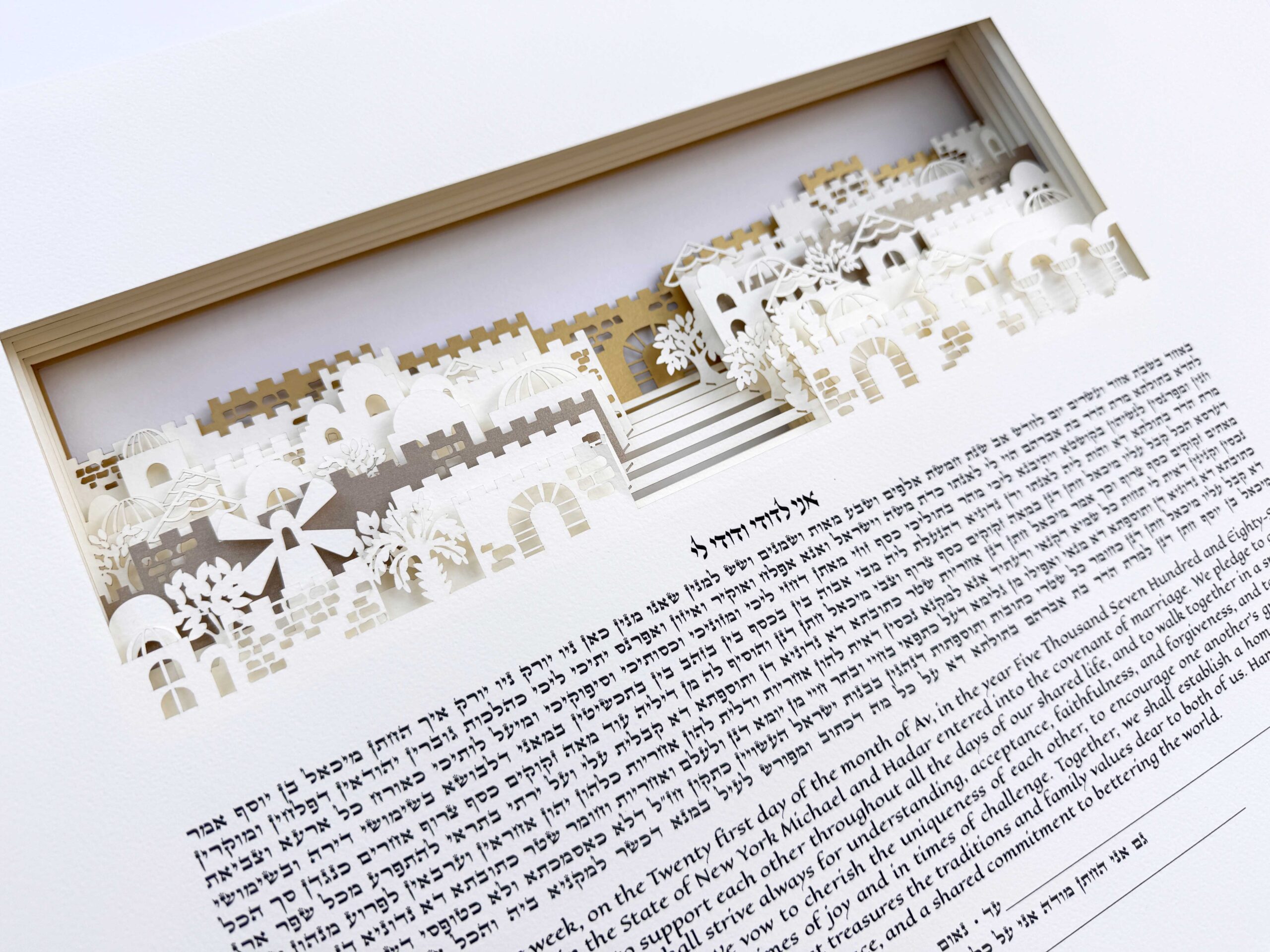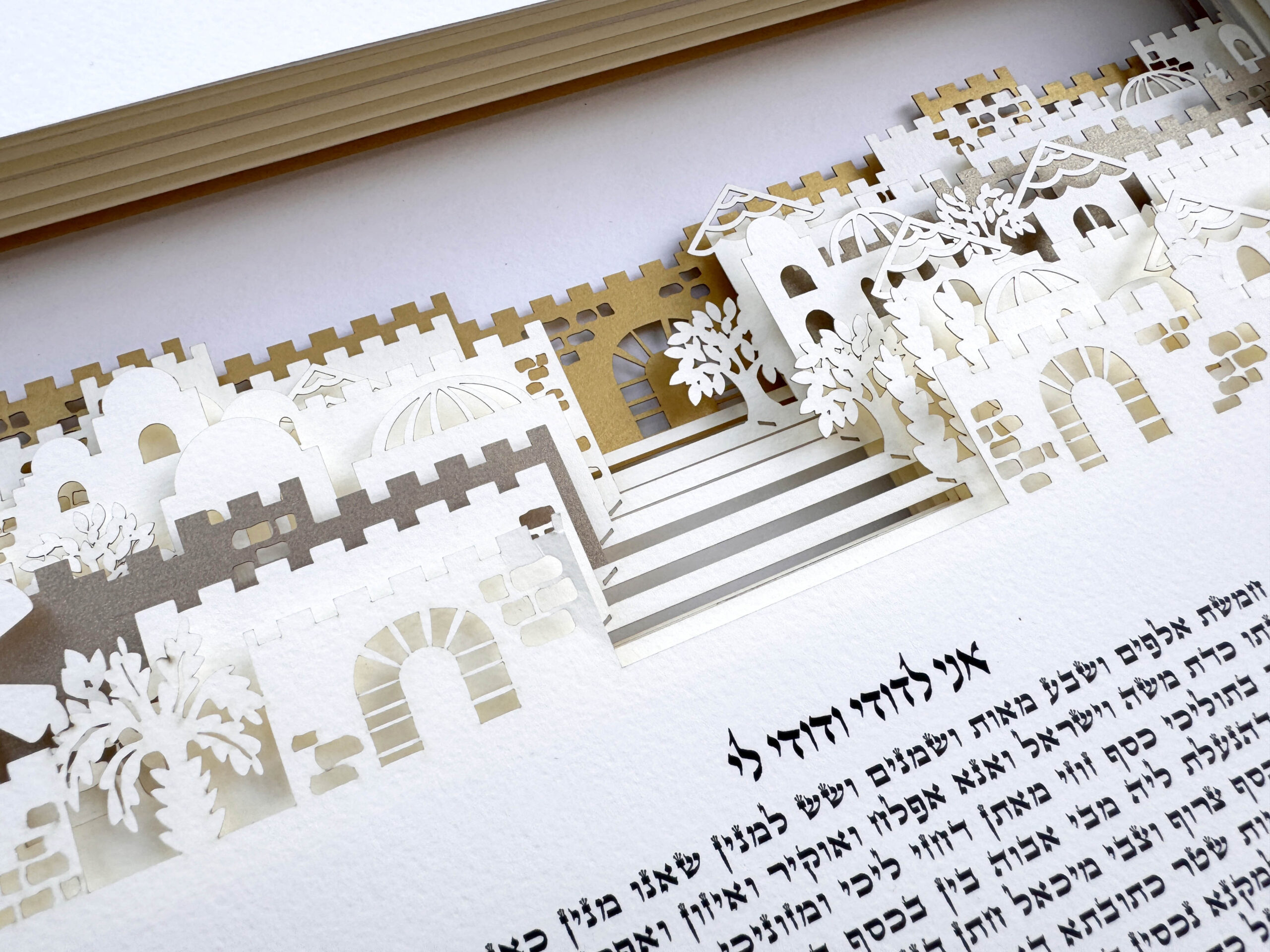 This Jerusalem skyline ketubah features a handcrafted 7-layer papercut inspired by the timeless architecture of the Old City. Designed for modern Jewish weddings, this Jerusalem wedding ketubah transforms your vows into meaningful Jewish wedding art rooted in heritage and strength.