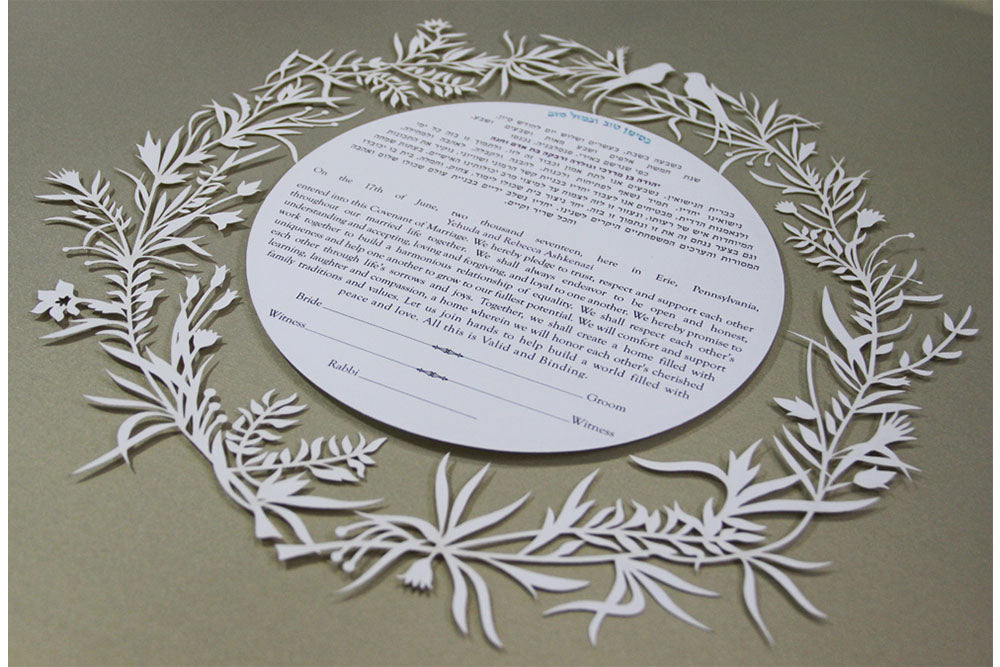 Our Ketubahs are cut out on fine art paper of the highest quality and the text is printed on Gicle Museum art paper.