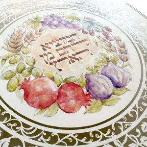 This beautiful Cutting Challah board with a 24K Gold border rim has a cut design with the central Blessing, “who brings forth bread from the earth” and is surrounded with a cut out of the seven species that Israel was blessed with. around the cut of the seven species, you could see a leafs. and painted pomegranates.