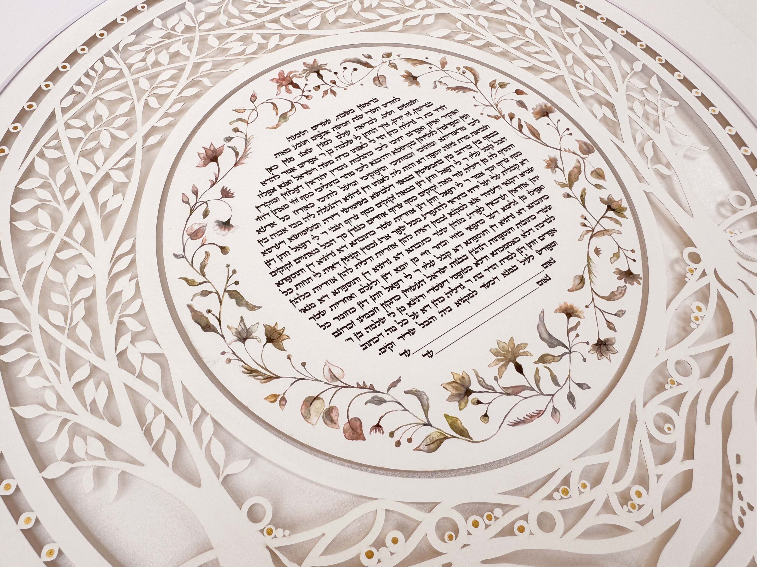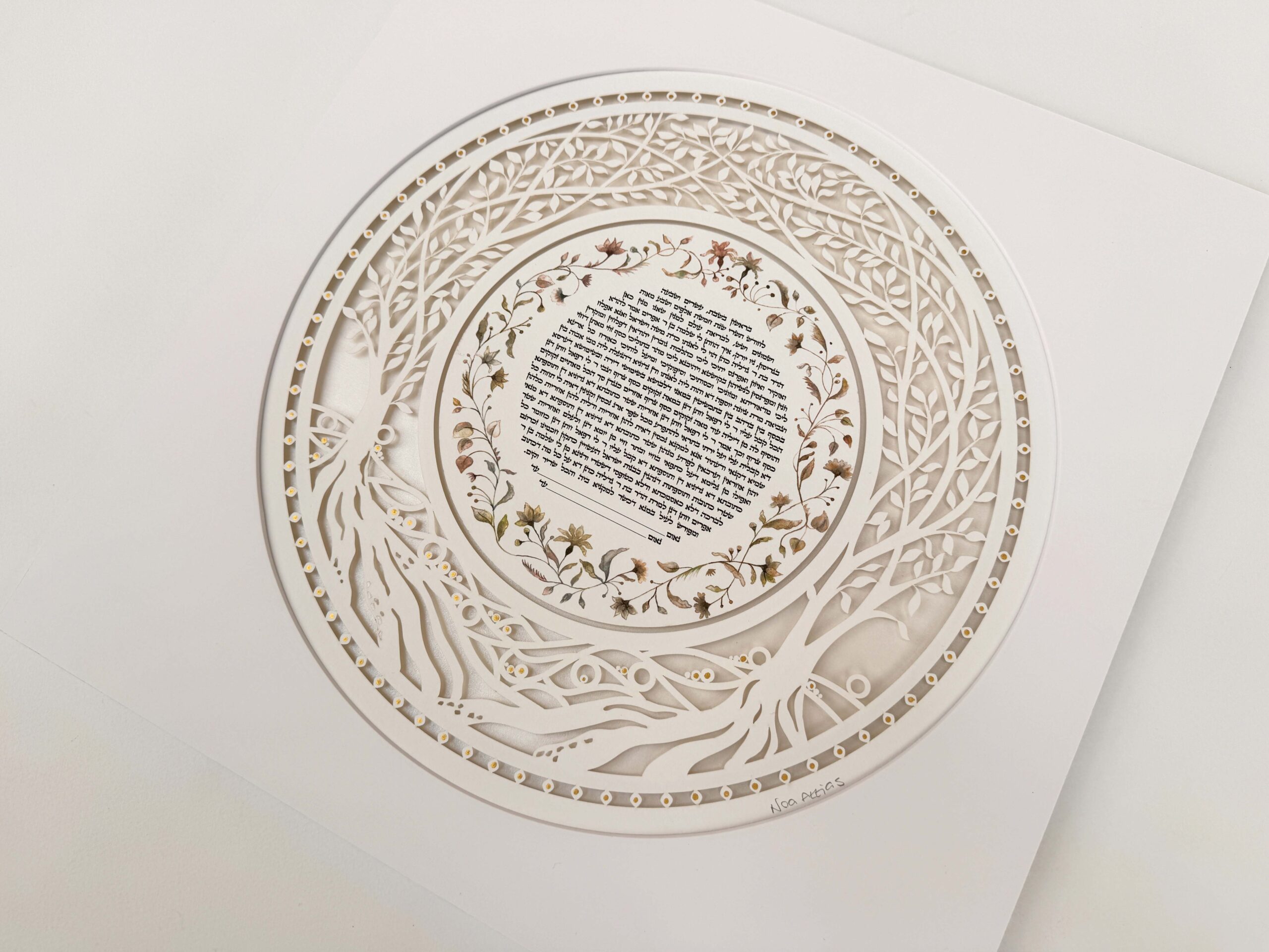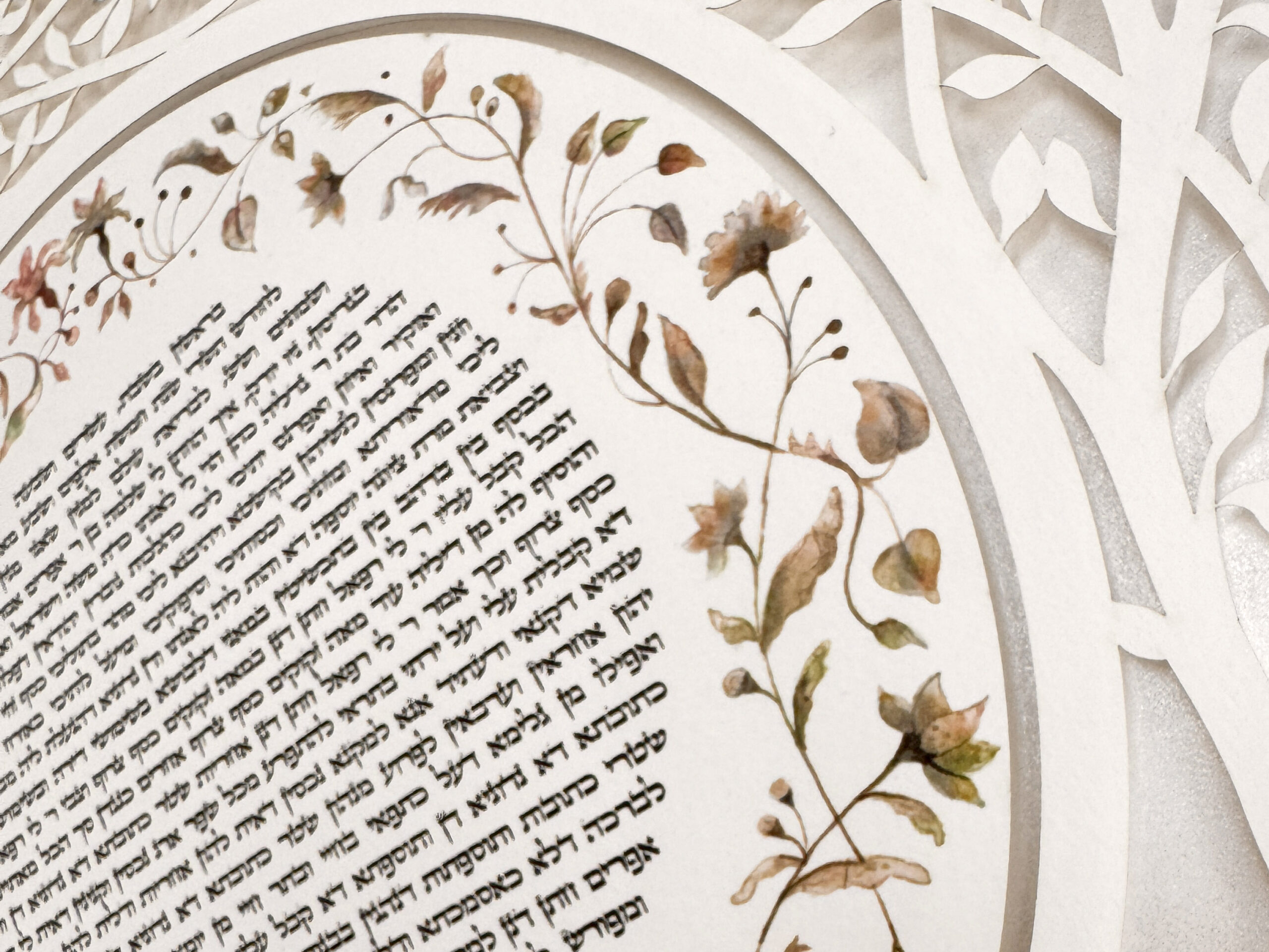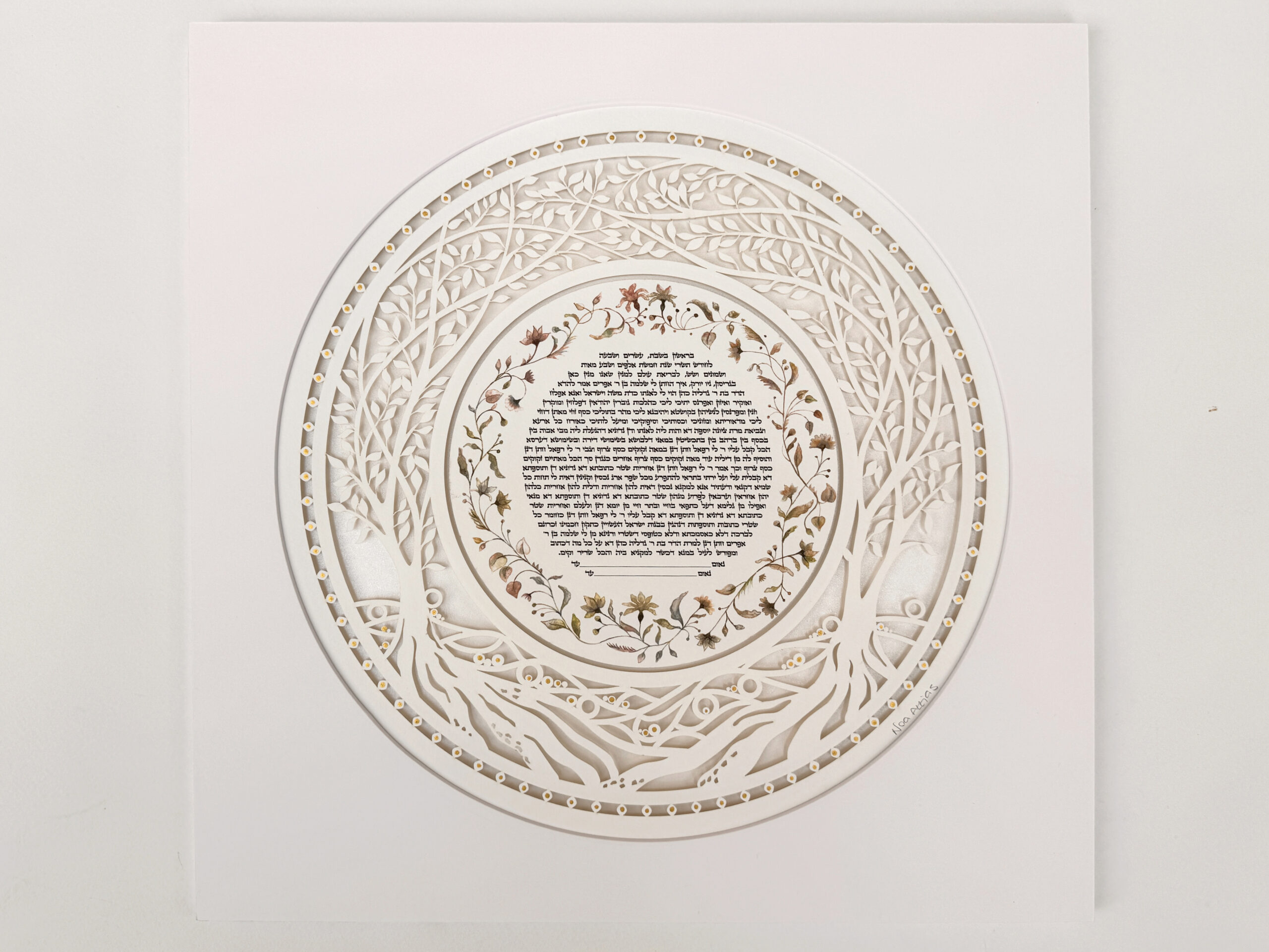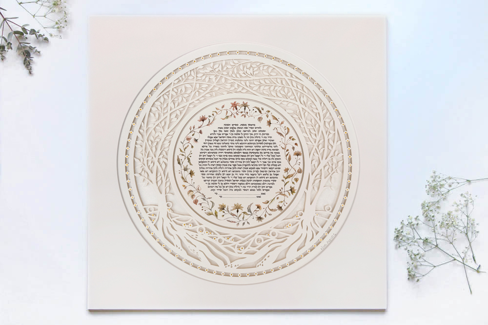 Our Ketubahs are cut out on fine art paper of the highest quality and the text, flower circle, and backround is printed on  Gice Museum art paper.