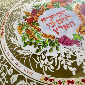 This beautiful Cutting Challah board with a 24K Gold border rim has a cut design with the central Blessing, “who brings forth bread from the earth” and is surrounded with a cut out of the seven species that Israel was blessed with. around the cut of the seven species, you could see a leafs. and painted pomegranates.