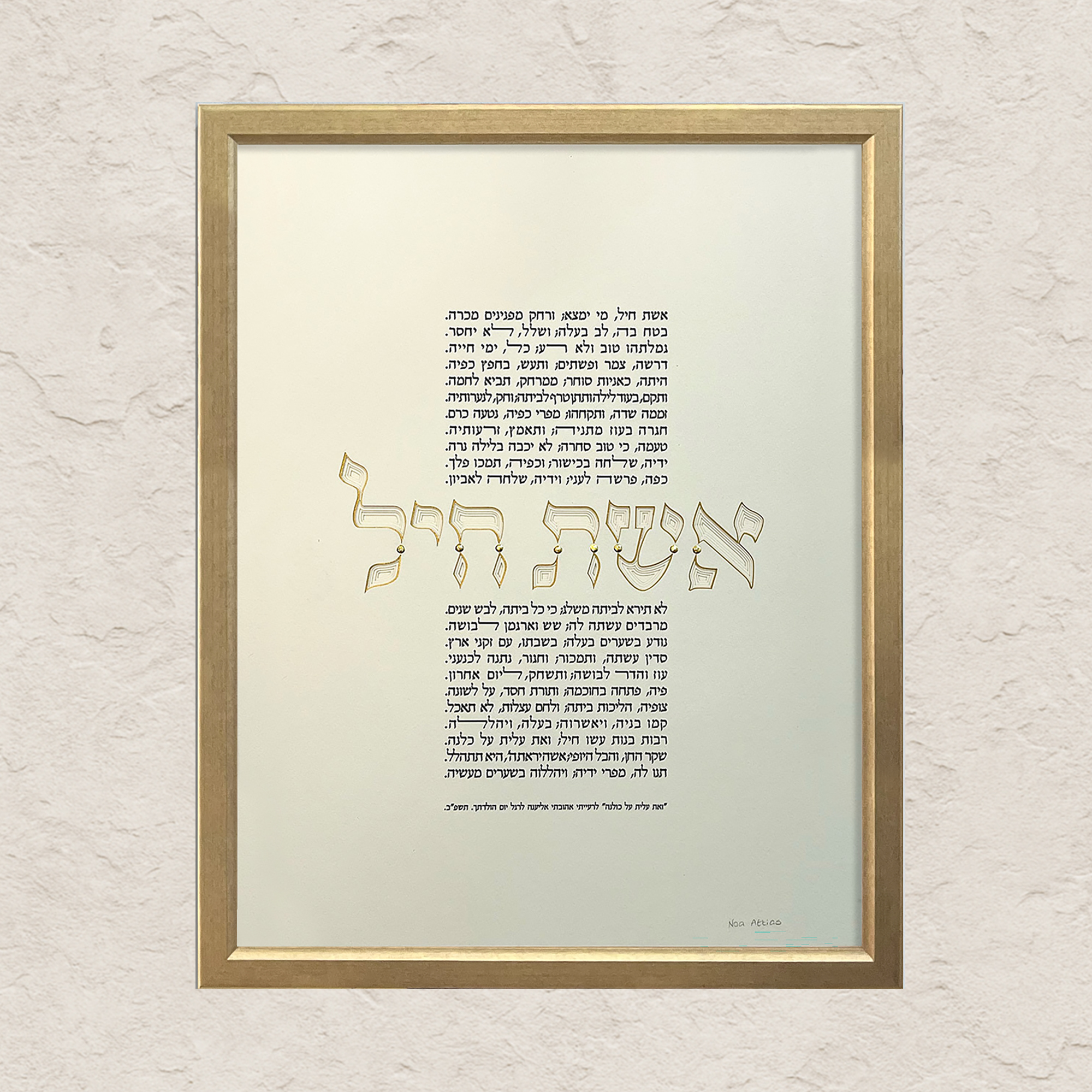 Eshet Chayil is a twenty-two verse poem with which King Solomon concludes the book of Proverbs (Proverbs 31). The poem has an acrostic arrangement in which the verses begin with the letters of the Hebrew alphabet in regular order. The poem describes the woman of valor as one who is energetic, righteous, and capable.