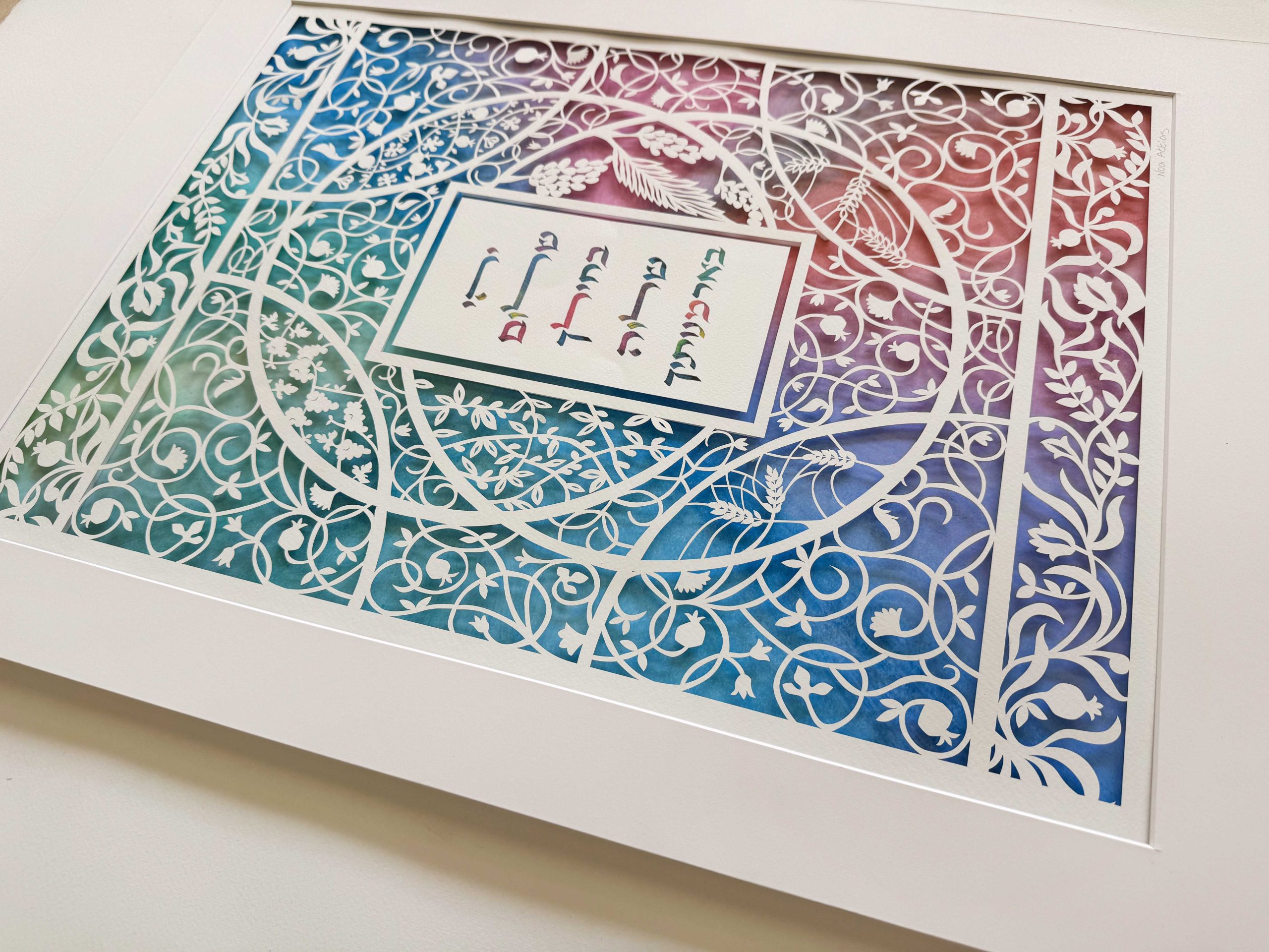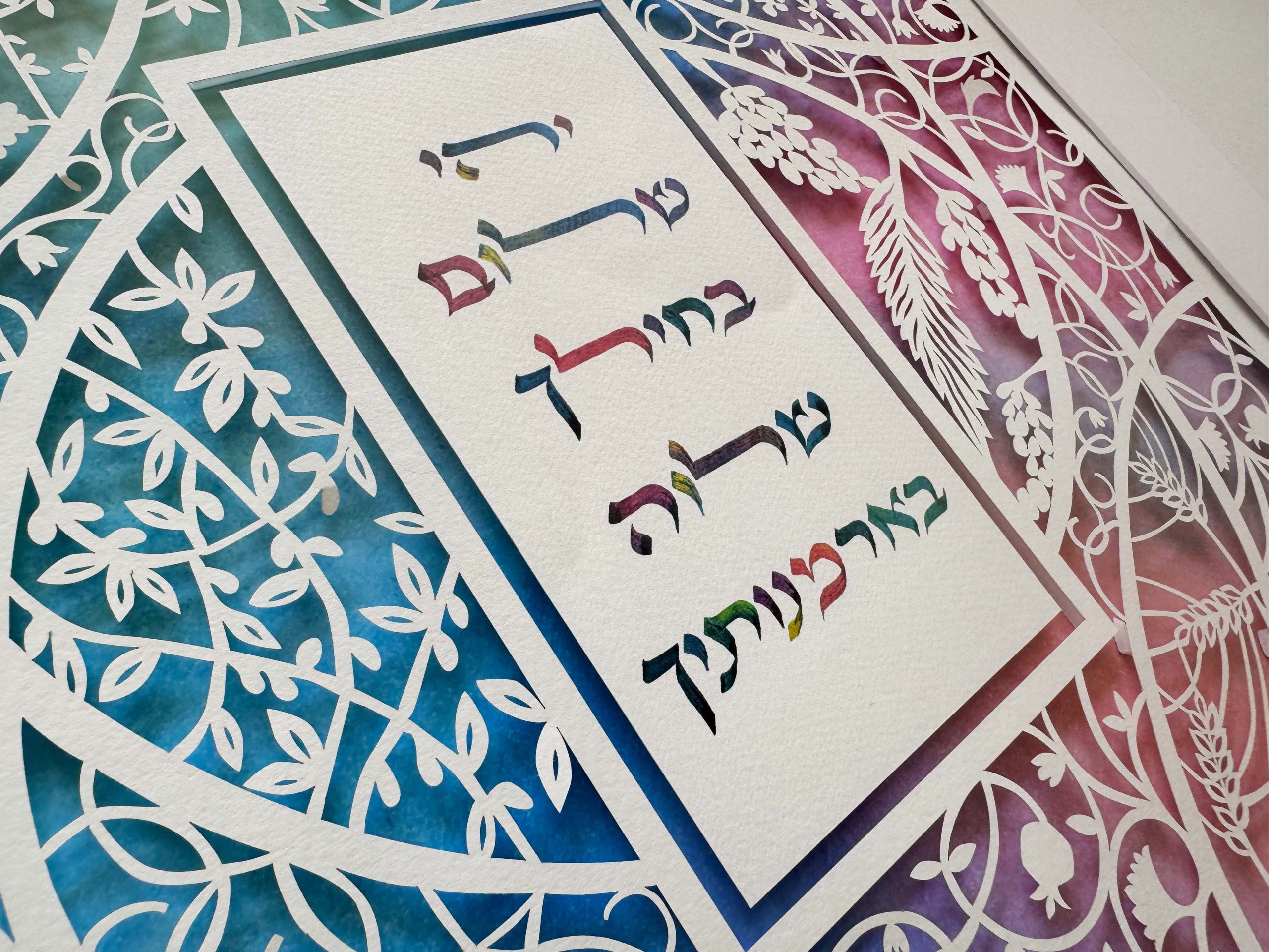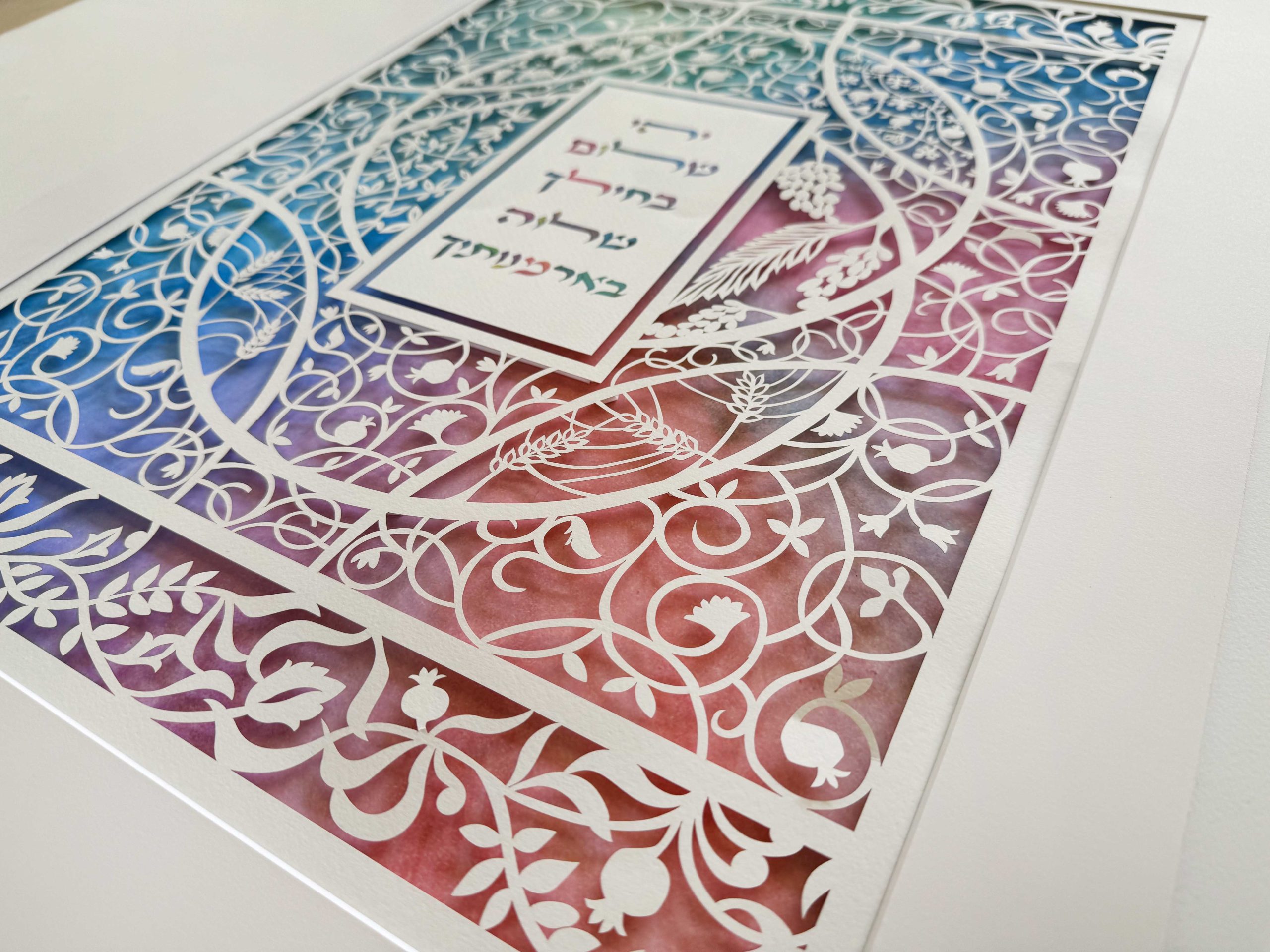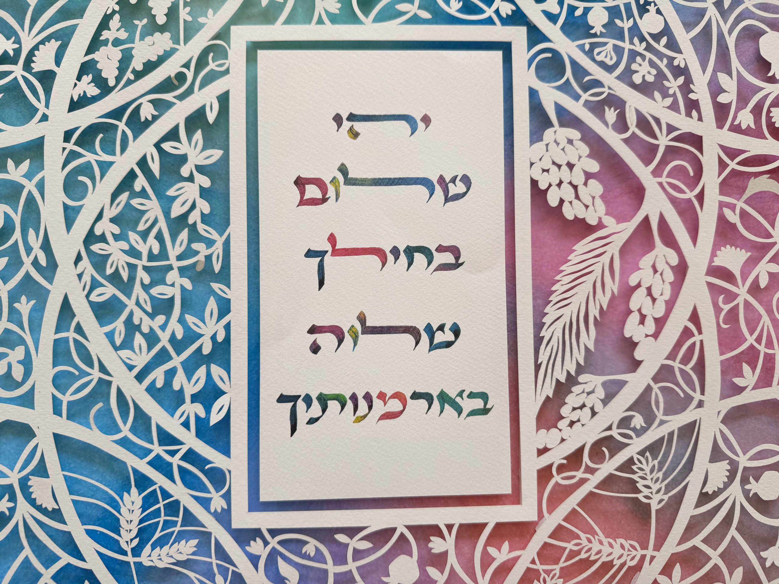 This design blends colorful hand-painted details with intricate paper cutting. In addition, it features the landscape of Jerusalem. It also includes the Seven Species mentioned in the Bible as unique to the Land of Israel.